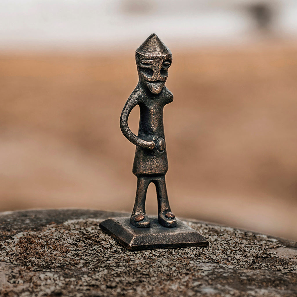 This 10 cm (3.9 inches) tall bronze figurine depicts Odin, the Viking god. It is a reproduction of the original figurine that was found in Lindby, Sweden. Our reproduction misses the left arm, just as the original one. Odin is a prominently mentioned god throughout the recorded history of the Germanic peoples, from the Roman occupation of regions of Germania to the Viking Age. Odin is associated with healing, death, royalty, the gallows, knowledge, battle, sorcery, poetry, frenzy, and the runic alphabet.