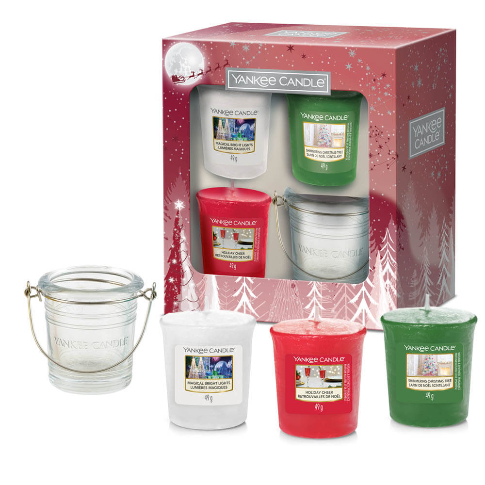 1 x Magical Bright Lights Votive Candle, 1 x Sparkling Christmas Tree Votive Candle, 1 x Holiday Cheer Votive Candle, Accessory 1 x Clear Bucket Votive Holder.