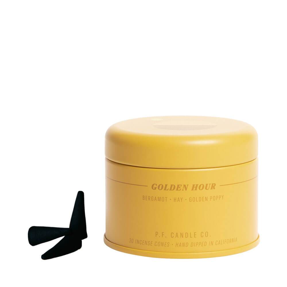 Incense cones are packed in custom printed tin vessels donned with earth toned motifs, sun shapes, and horizon lines inspired by the scenes of summer in California. Each cone burns for approximately 25 minutes, elevating a space with scent in under an hour. Depending on room size, scent longevity lasts between 2-4 hours. Each tin contains measures 3 inch in diameter and 2.2 inch in height, and contains 30 incense cones.