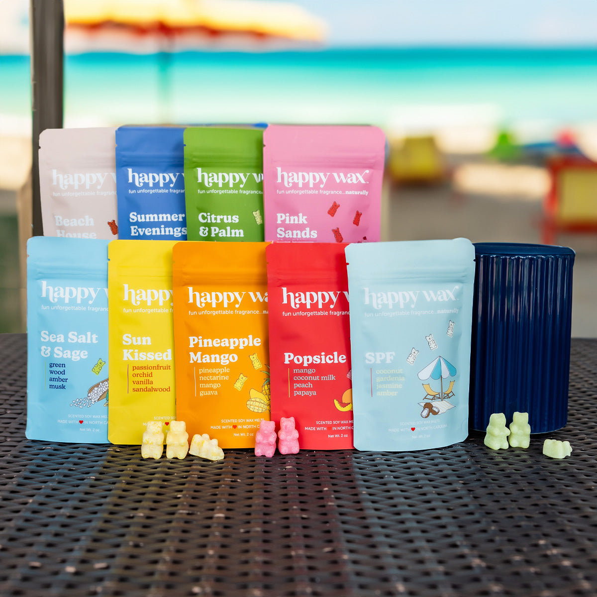 Included in this bundle are (1) Indigo Mod Wax Warmer and (9) 2oz pouches of our Summer scents, detailed below!